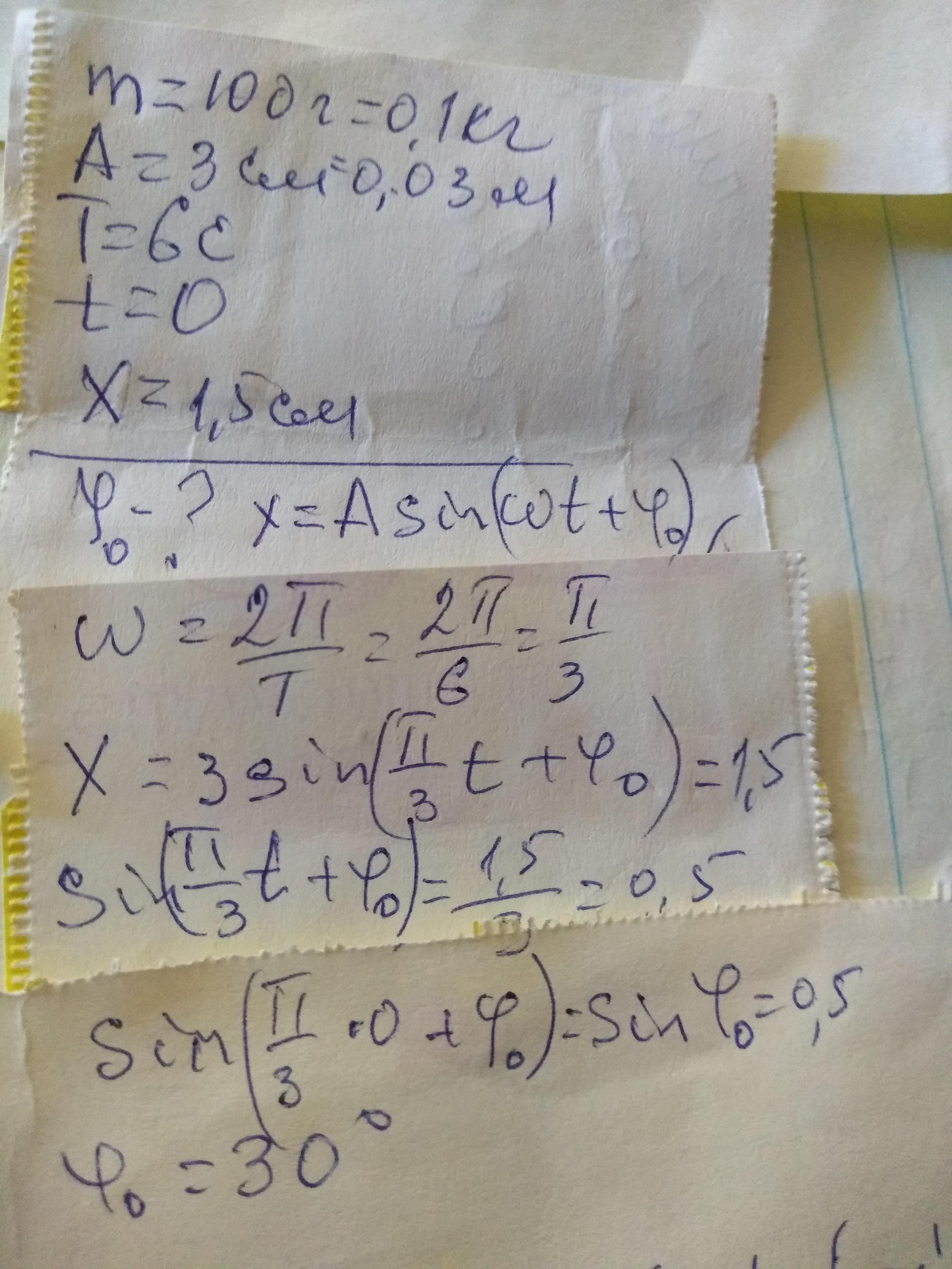 7. Кулька масою 100 г здійснює синусоїдальнi коливання з амплітудою 3 см і періодом 6 с. Яка початкова фаза ф. коливань (в градусах), якщо в момент часу 1=0, змiщення кульки дорівнювало 1,5 см.