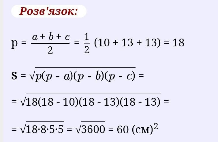 Периметр рівнобедреного трикутника дорівнює 36 см, бічна сторона на 3 більша за основу. Знайти площу трикутника.