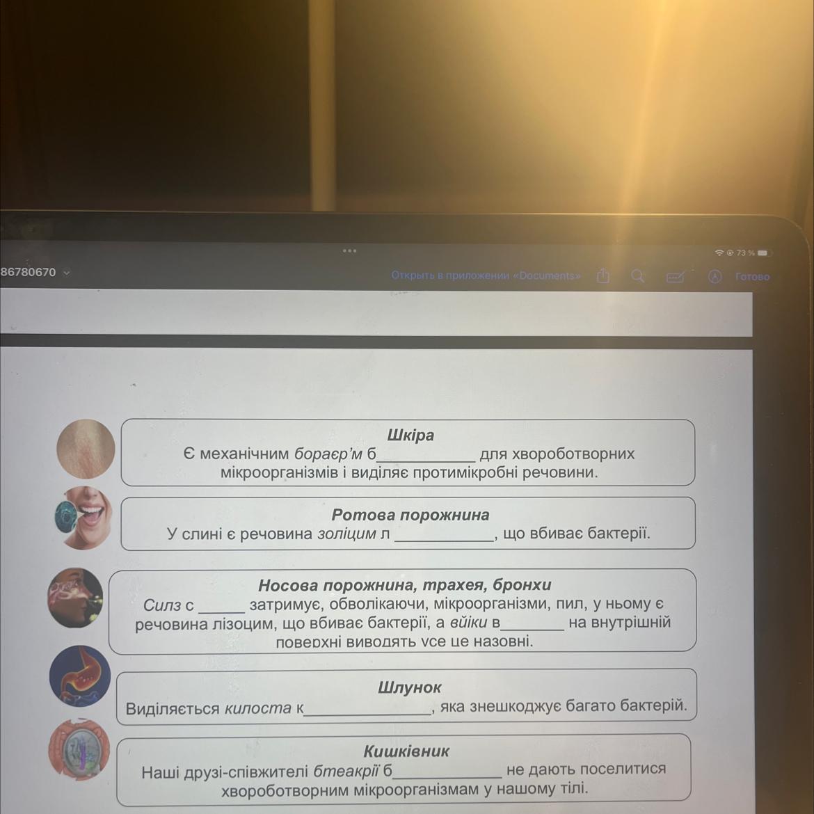 Ответ: бар"єром, лізоцим, слиз війки, бактерії