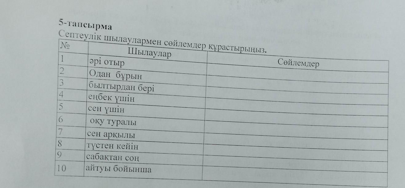 5-тапсырма Септеулік шылаулармен сөйлемдер құрастырыңыз. No Шылаулар 1 2 3 4 6 7 8 19 10 әрi отыр Одан бұрын былтырдан бері еңбек үшін сен үшін оку туралы сен аркылы түстен кейiн сабактан сон айтуы бойынша Garagay knutepuši Сөйлемдер