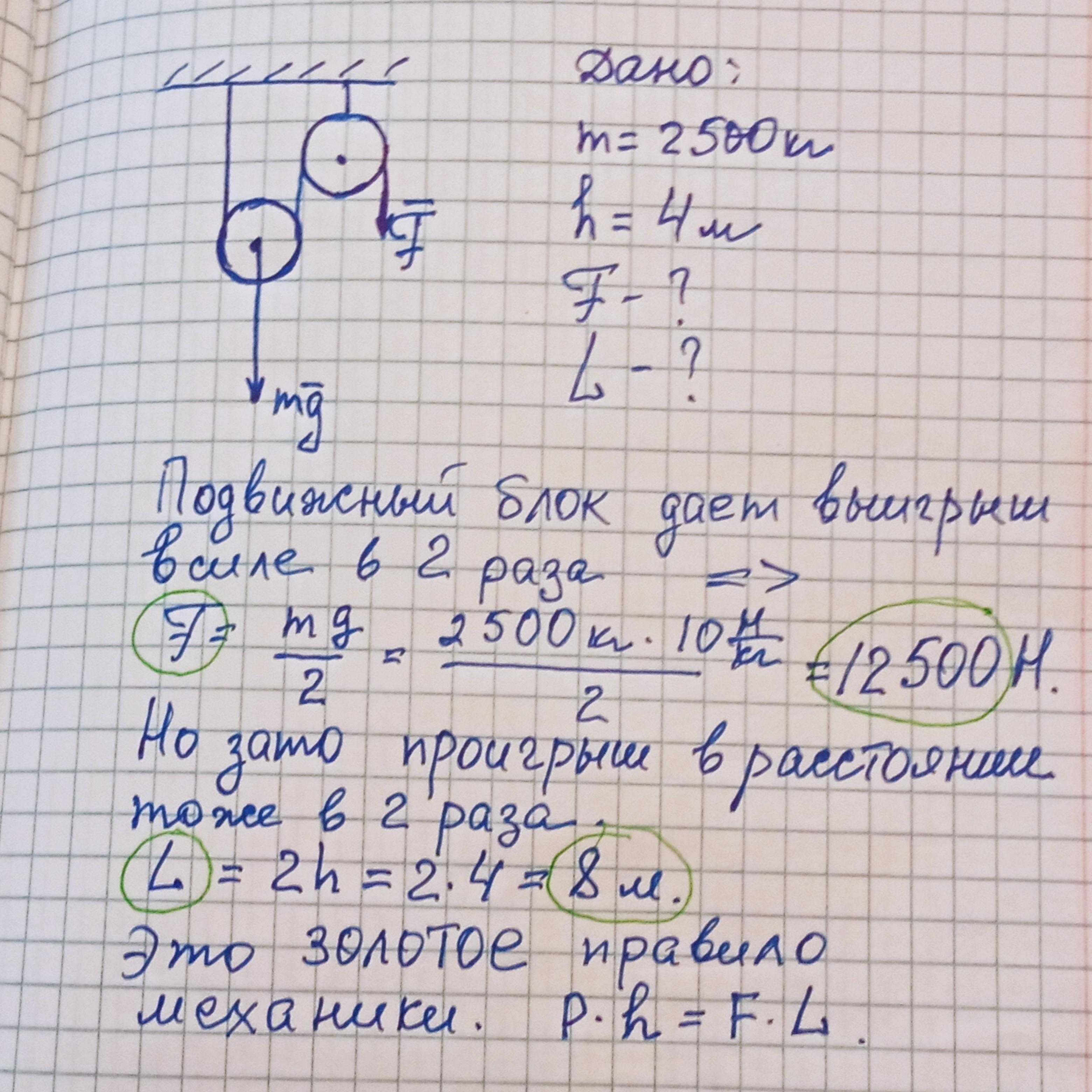 P=2,5т; h=4м; g=10 H/кг, F-?; L-? Розв'язання: щоб знайти силу потрібно Вагу поділити на два: P/2; F=2500кг/2 (2,5 т = 2,500 кг) F≈1,250кг; Далі шукаємо L: щоб знайти відстань потрібно висоту помножити на два: 2h (або 2•h); отримали: 8 метрів