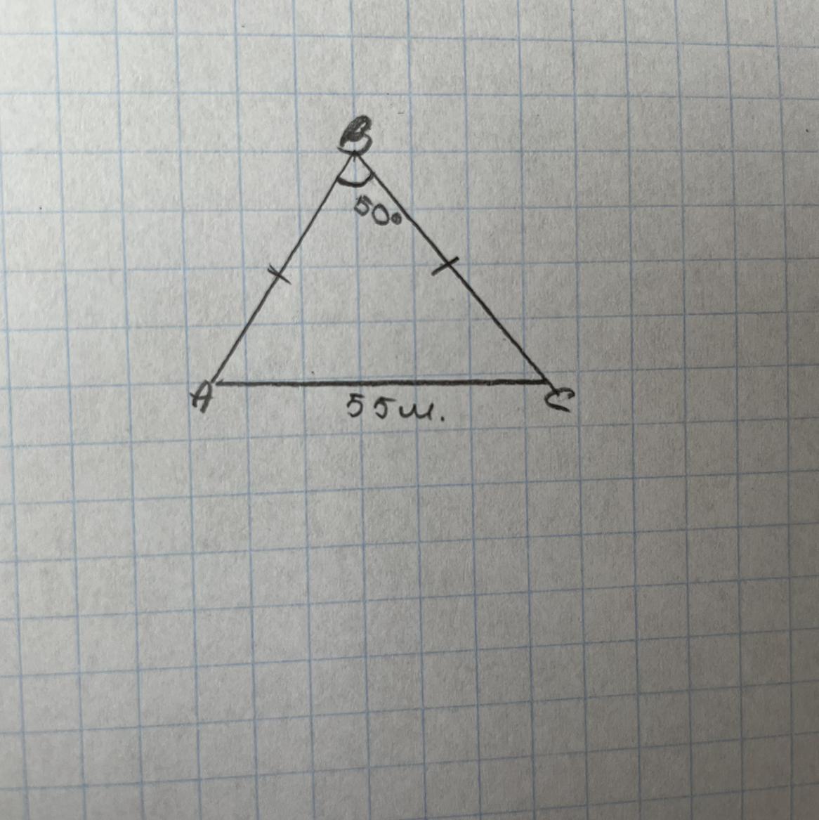 Побудуйте рівнобедрений трикутник основа якого дорівнює 55мм а кут при вершині 50 градусів ( допоможіть)