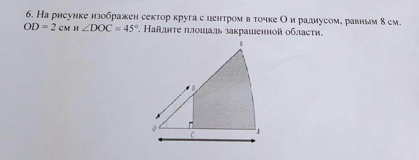 6. На рисунке изображен сектор круга с центром в точке О и радиусом, равным 8 см. OD = 2 см и уголDOC = 45°. Найдите площадь закрашенной области.