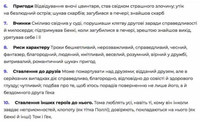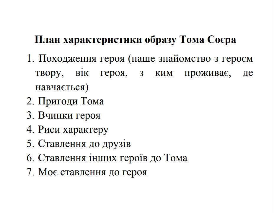 Характер Тома як не можна краще розкритий в першому розділі, в якому Том, в покарання за те, що напередодні замість відвідування школи ходив купатися в річці, засуджений тіткою Поллі на побілку довгого забору в суботу – у вихідний день, у який у решти хлопчиків намічені веселі ігри . З сумом подумавши про те, як інші хлопці будуть знущатися над тим, що він змушений працювати, Том став винаходити план того, як позбавитися від обов’язку хоч ненадовго. Він розрахував, що за «скарби» з надр його кишені, начебто дохлого пацюки на мотузочці (щоб зручно було його крутити) або нічого не відкриваючого ключа він може купити лише дещицю свободи. Сумно розмірковуючи, Том помітив, що наближається Бен, задирання якого Том ніяк не бажав терпіти. Єдиний спосіб для Тома зберегти свою честь був прикинутися, що він працює за власним бажанням.