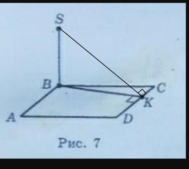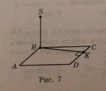 До площини ромба ABCD проведено перпендикуляр SB; BK ⊥ DC. Укажіть відстань від точки S до прямої DC