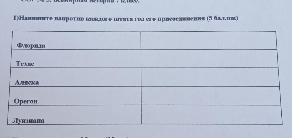1)Напишите напротив каждого штата год его присоединения (5 баллов) Флорида Texac Аляска Орегон Луизиана