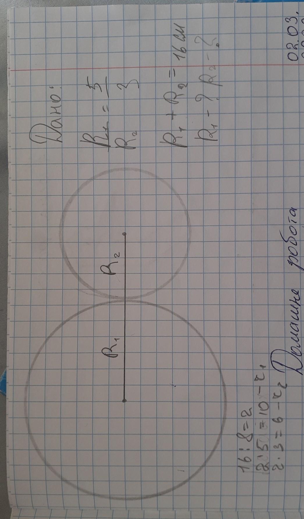 Відстань між центрами двох кіл, що дотикаються, дорівнює 24 см. Знайдіть радіуси цих кіл, якщо вони відносяться як 5:3. Розгляньте всі можливі випадки.