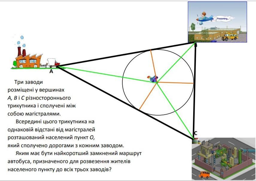 Оскільки населений пункт О розташований на однаковій відстані від магістралей, то відрізки, які з'єднують кожен завод з О, мають однакову довжину.