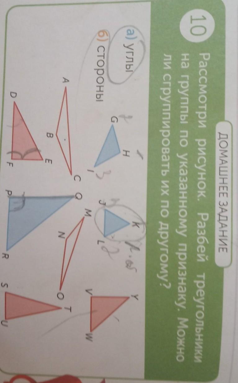 92 10 ДОМАШНЕЕ ЗАДАНИЕ Рассмотри рисунок. Разбей треугольники на группы по указанному признаку. Можно ли сгруппировать их по другому? к роб а) углы б) стороны A D G H B E F С P 3 M. L N R S U WV