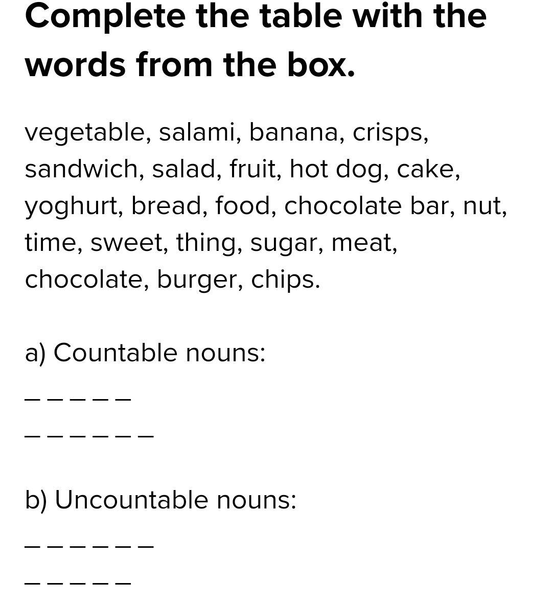 2 A B Complete the table with the words below. vegetable salami banana crisps sandwich salad fruit hot dog cake yoghurt bread food chocolate bar nut time sweet thing sugar meat chocolate burger chips Countable nouns: vegetable Uncountable nouns: salami