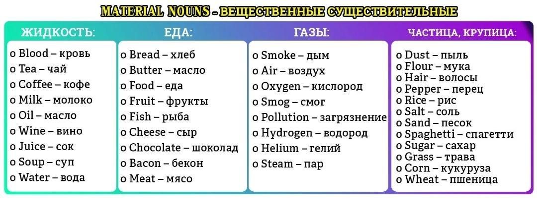 б) Неисчисляемые существительные: