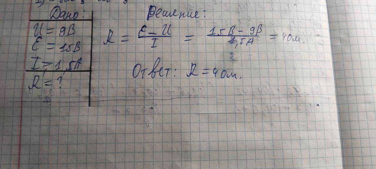 примите решить задачу через дано пожалуйста. напряжение во внешней цепи 9В а ,ток 1,5 А . Определите сопротивление источника если ЭДС 15В