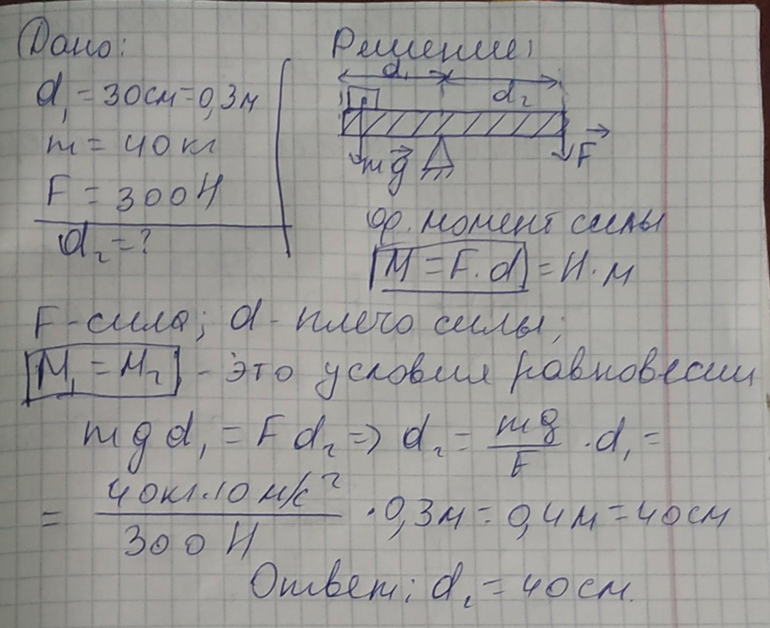 9. На коротком плече рычага подвешен груз массой 40 кг. укрепленный на расстоянии 30 см от точки опоры. Для его подъема к длинному плечу приложили силу 300 Н. Определите плечо этой силы