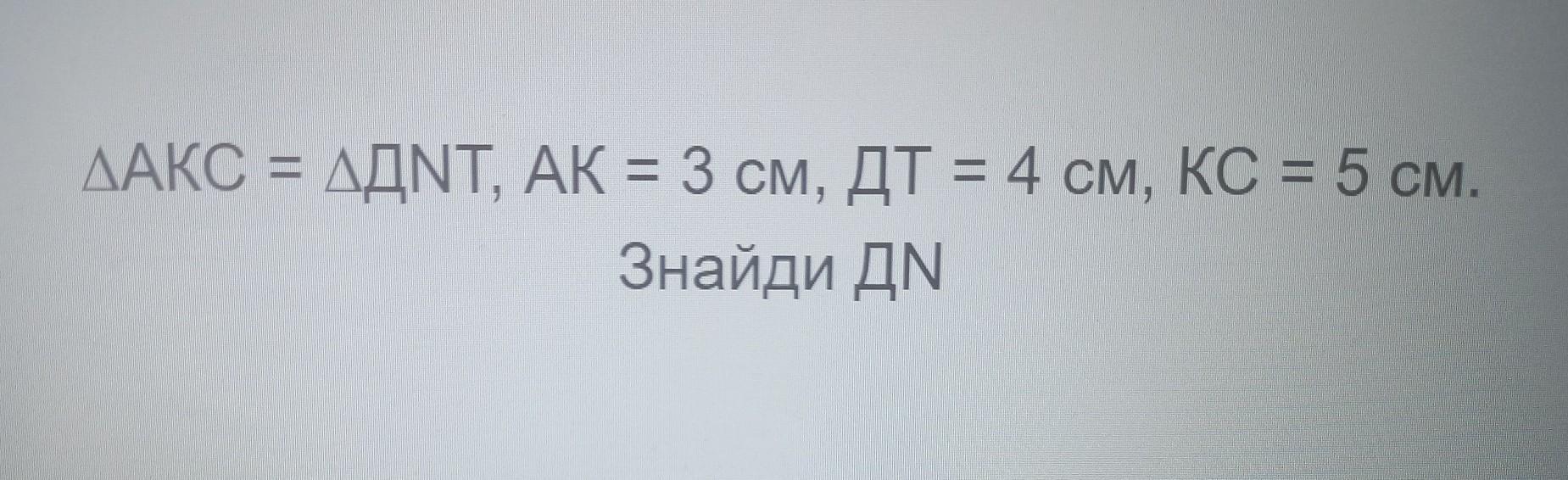 Оскільки трикутник AKC = трикутнику DNT, то відповідно AK=DN, KC=NT, AC=DT.