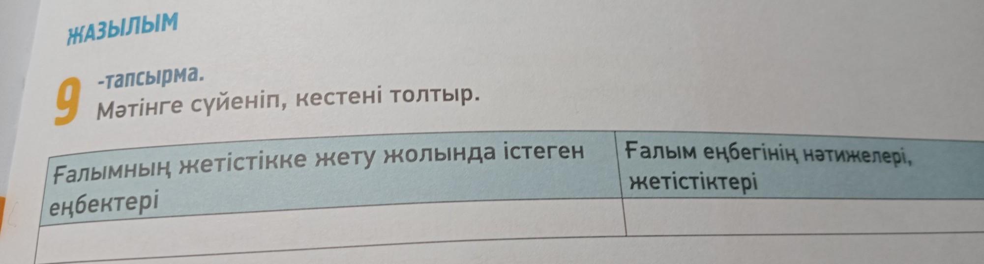 9 -тапсырма. Мәтінге сүйенiп, кестені толтыр. Ғалымның жетістікке жету жолында істеген еңбектері Ғалым еңбегінің нәтижелері, жетістіктері