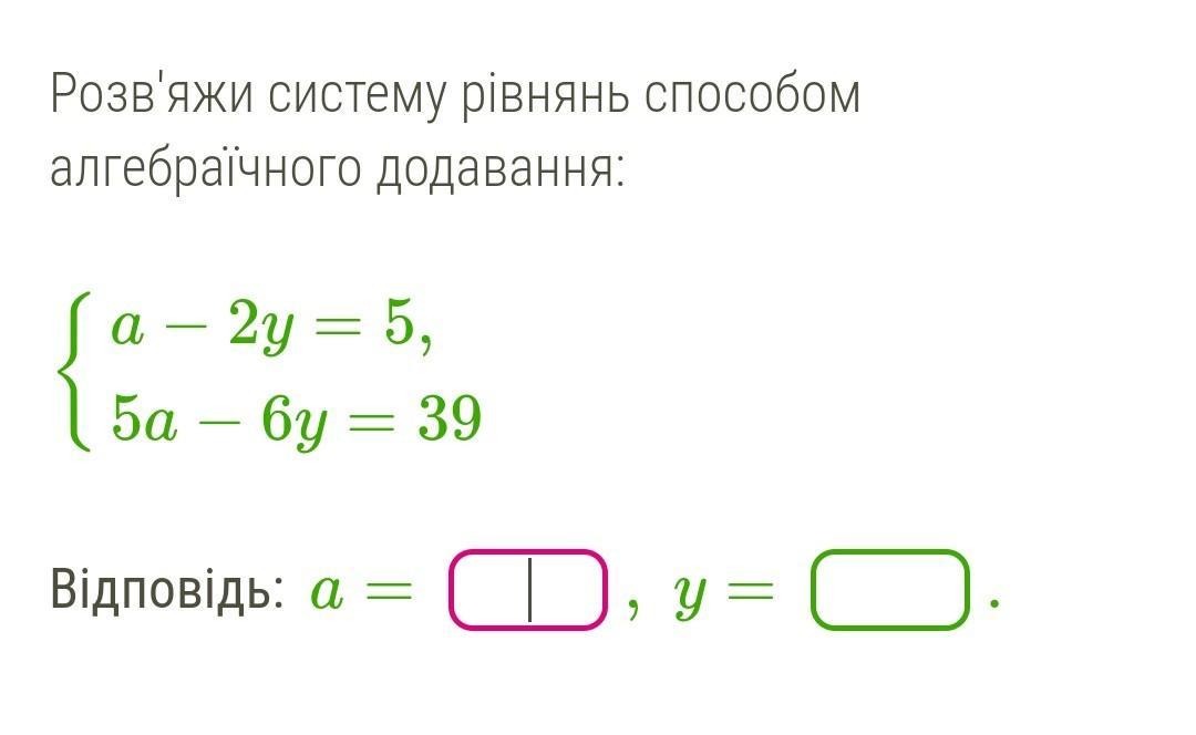 Розв'яжи систему рівнянь способом алгебраїчного додавання: - - f a - 2y = 5, 5a-6y бу - = 39 Відповідь: а — D - У , O.