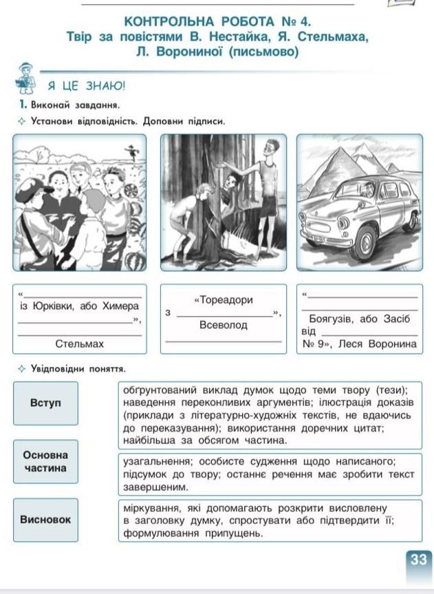 ПОМОГИЬЕ ПОЖАЛУЙСТА ❗ ❗ ❗ КОНТРОЛЬНА РОБОТА № Твір за повістями В. Нестайка, Я. Стельмаха, л. Ворониної (письмово) Я ЦЕ ЗНАЮ! 1. Виконай завдання. Установи відповідність. Доповни підписи. iз Юрківки, або Химера Стельмах Увiдповiдни поняття. Вступ Основна частина Висновок 4. «Тореадори Всеволод I Боягузів, або засіб вiд № 9, Леся Воронина обгрунтований виклад думок щодо теми твору (тези); наведення переконливих аргументів; ілюстрація доказів (приклади з літературно-художніх текстів, не вдаючись до переказування); використання доречних цитат: найбільша за обсягом частина. узагальнення; особисте судження щодо написаного; підсумок до твору; останне речення має зробити текст завершеним. міркування, які допомагають розкрити висловлену в заголовку думку, спростувати або підтвердити її; формулювання припущень. 33
