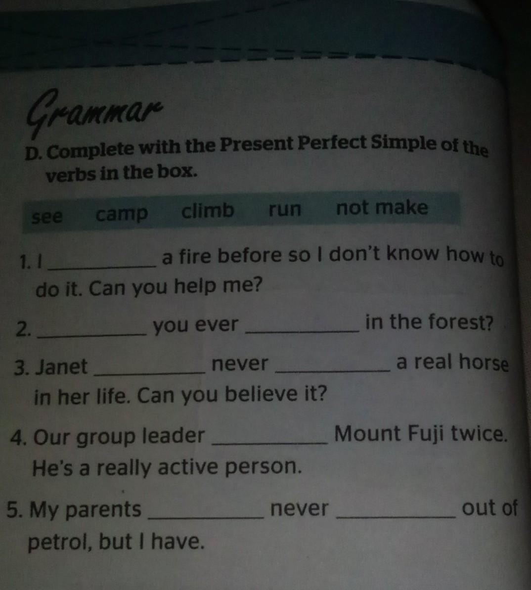 5. My parents have run out of petrol, but I have never camped before.