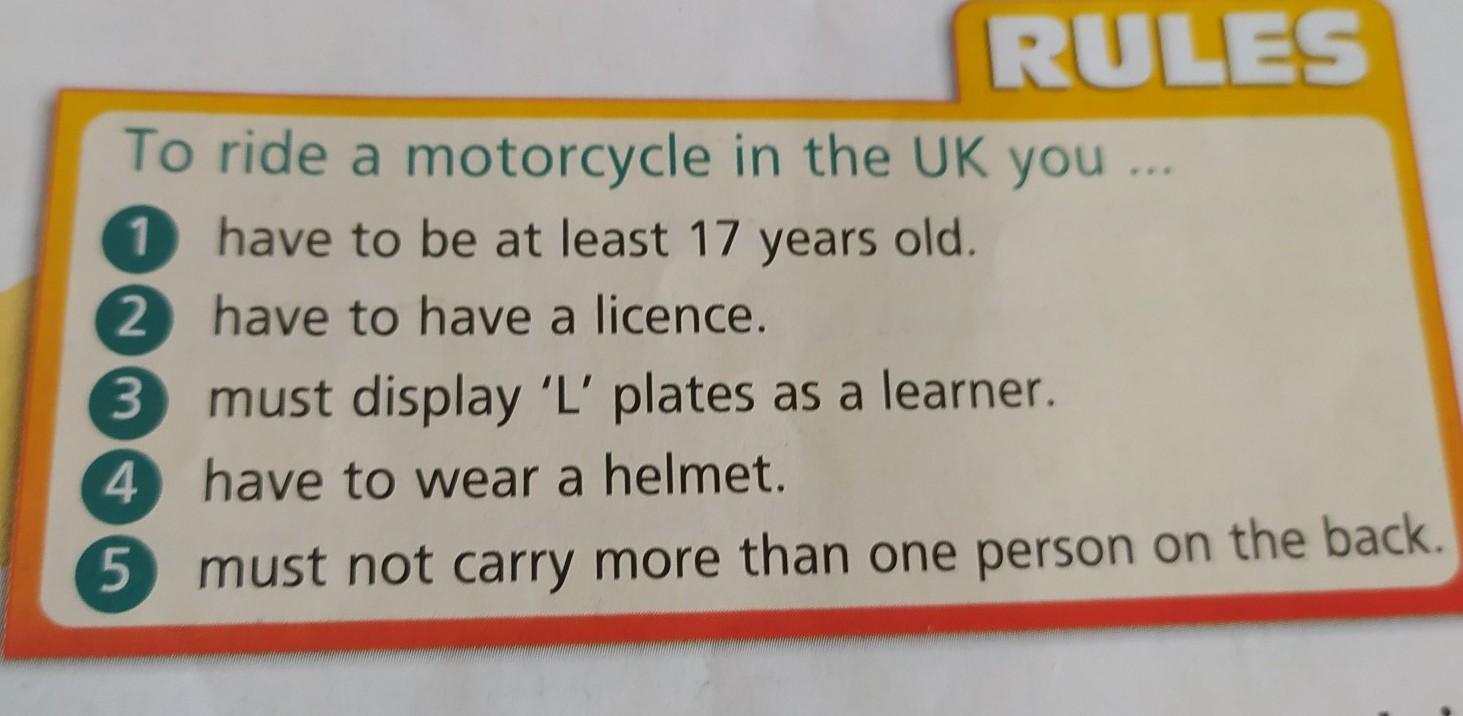 8 6.3.2.1 6.3.7.1 Student A, you are from the UK. Read the following information and be ready to answer Student B's questions. RULES To ride a motorcycle in the UK you ... 1 have to be at least 17 years old. have to have a licence. 2 3 must display 'L' plates as a learner. have to wear a helmet. 4 must not carry more than one person on the back. Student B, ask Student A to find out about riding a motorcycle in the UK. Ask about: age - licence - L plates - helmet - people on the back.