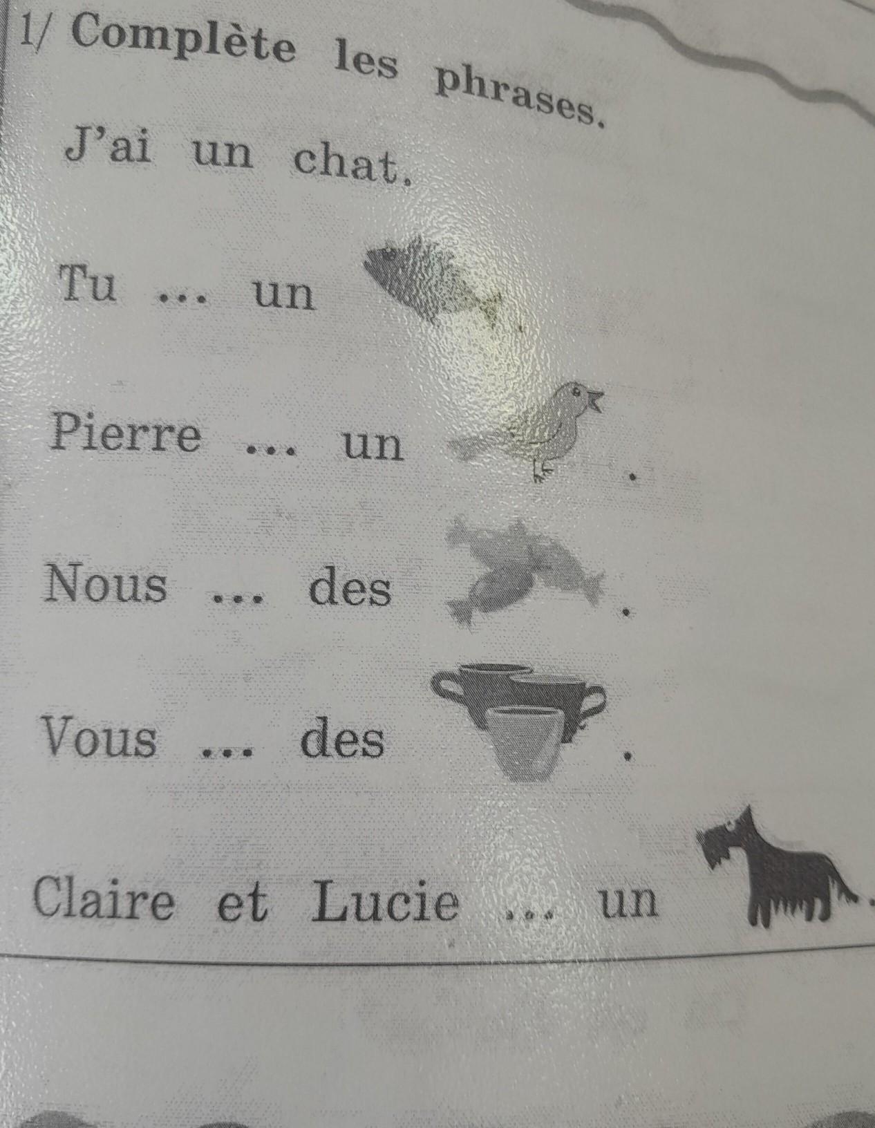 1/ Complète les phrases. J'ai un chat. Tu ... un Pierre .. un Nous... des Vous ... des Claire et Lucie ... un
