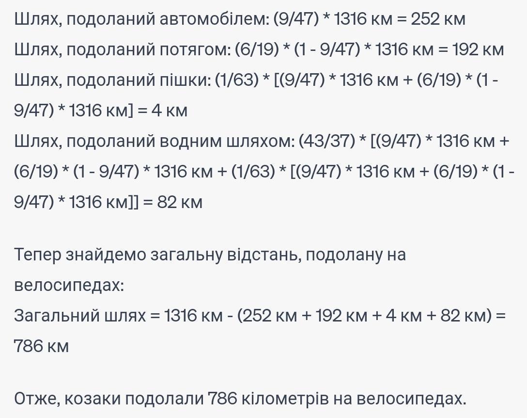 №1. Подорожуючи Україною, козаки зі Сходу на Захід подолали відстань 1316 км. Автомобілем вони проїхали 9/47 всього шляху, потягом - 6/19 решти, пішки подолали 1/63 відстані, яку проїхали автомобілем, а водним шляхом - 43/37 шляху, який подолали автомобілем, потягом та пішки разом. Завершили подорож козаки на велосипедах. Скільки кілометрів подолали козаки на велосипедах?