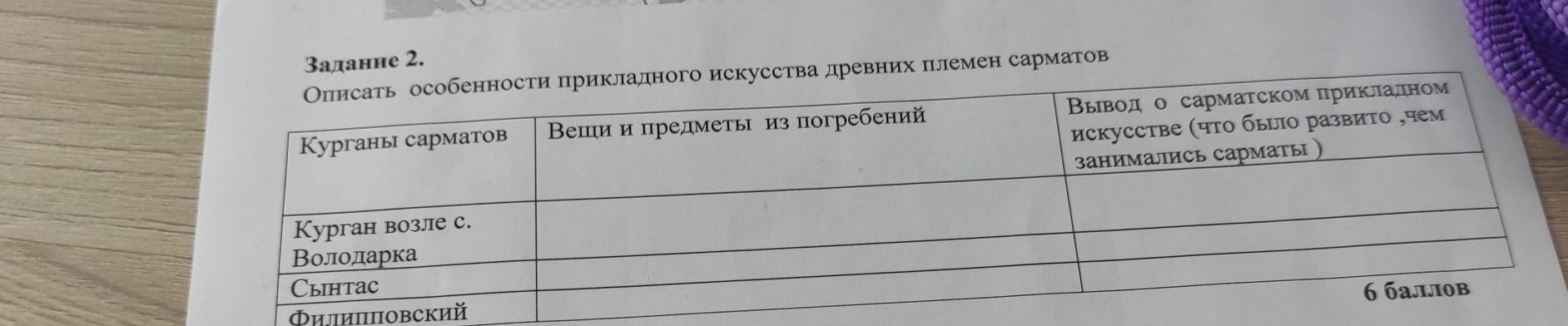 Задание 2. Описать особенности прикладного искусства древних племен сарматов Курганы сарматов Вещи и предметы из погребений Курган возле с. Володарка Сынтас Филипповский Вывод о сарматском прикладном искусстве (что было развито,чем занимались сарматы) 6 баллов долои