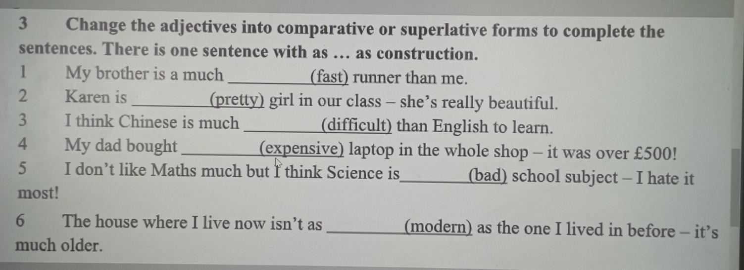 3 Change the adjectives into comparative or superlative forms to complete the sentences. There is one sentence with as ... as construction
