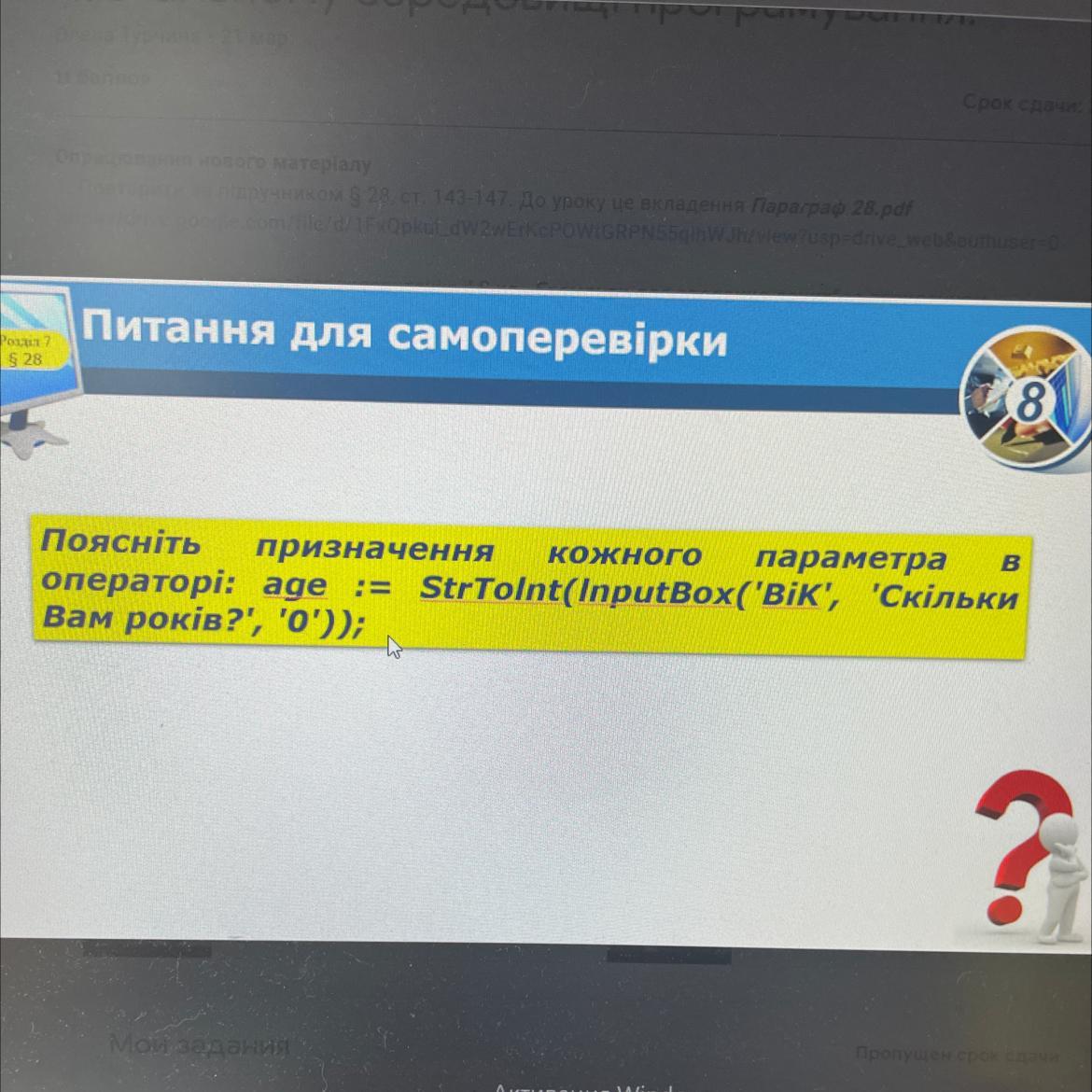 Отже, параметр age буде містити числове значення віку, яке користувач ввів у вікно запиту на введення тексту, після його конвертації зі стрічкового формату. Це значення можна використовувати далі в програмі для прийняття рішень на основі віку користувача.