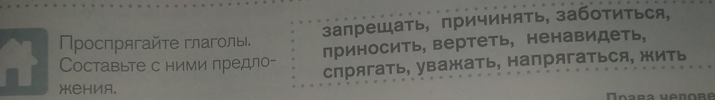 Н Проспрягайте глаголы Составьте с ними предло- жения. запрещать, причинять, заботиться, приносить, вертеть, ненавидеть, спрягать, уважать, напрягаться, жить