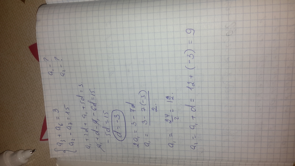 Сумма третьего и шестого членов арифметической прогрессии равна 3. Второй ее член на 15 больше седьмого. Найдите первый и второй члены этой прогрессии. СРОЧНО!!! ПОЖАЛУЙСТА.