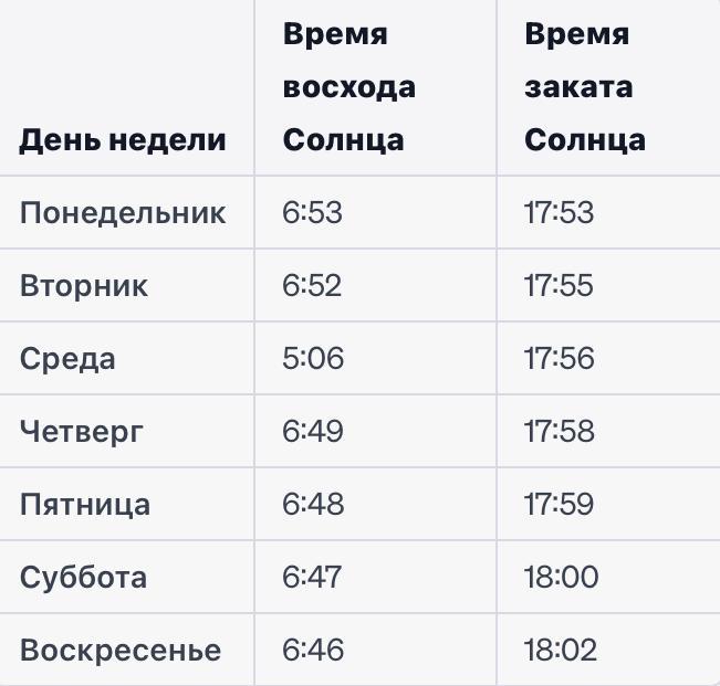 В таблице, на фото, представлены данные о времени восхода и заката Солнца на каждый день недели, начиная с понедельника и заканчивая воскресеньем.