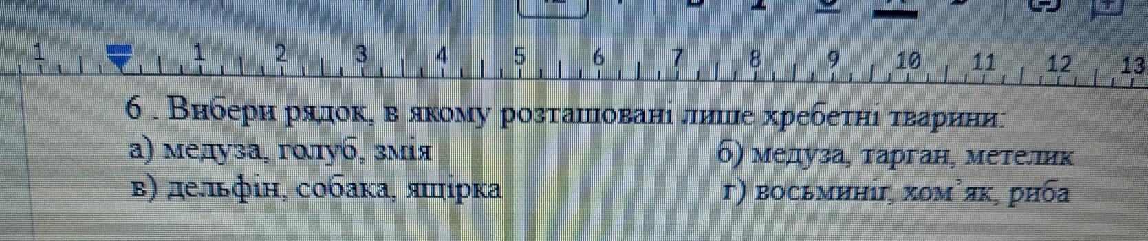 6. Вибери рядок, в якому розташовані а) медуза, голуб, змiя в) дельфін, собака, ящірка лише хребетні тварини: б) медуза, тарган, г) восьминіг, метелик хом'як, риба