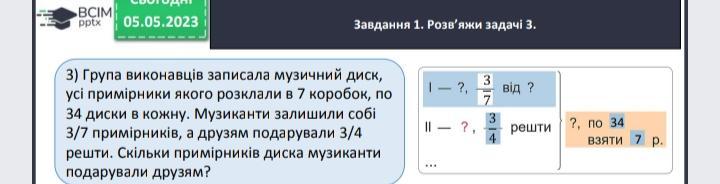 Всього 7*34=238 Собі 7*34*3/7=34*3=102; Решта 238-102=136; друзям 136*3/4=102; по-іншому: решта 1-3/7=4/7; Друзям (3/4)*(4/7)=3/7 від всього, тобто 7*34*3/7=34*3=102;