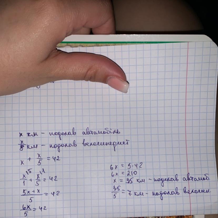 Назустріч один одному із різних челищ одночасно виїхали автомобіль і велосипедист.Велосипедст до зустрічі подолав шлях у 5 разів менший,ніж автомобіль.Який шлях подолав велосипедст та автомобіль окремо до зустрічі, якщо відстань між селищами 42 км?