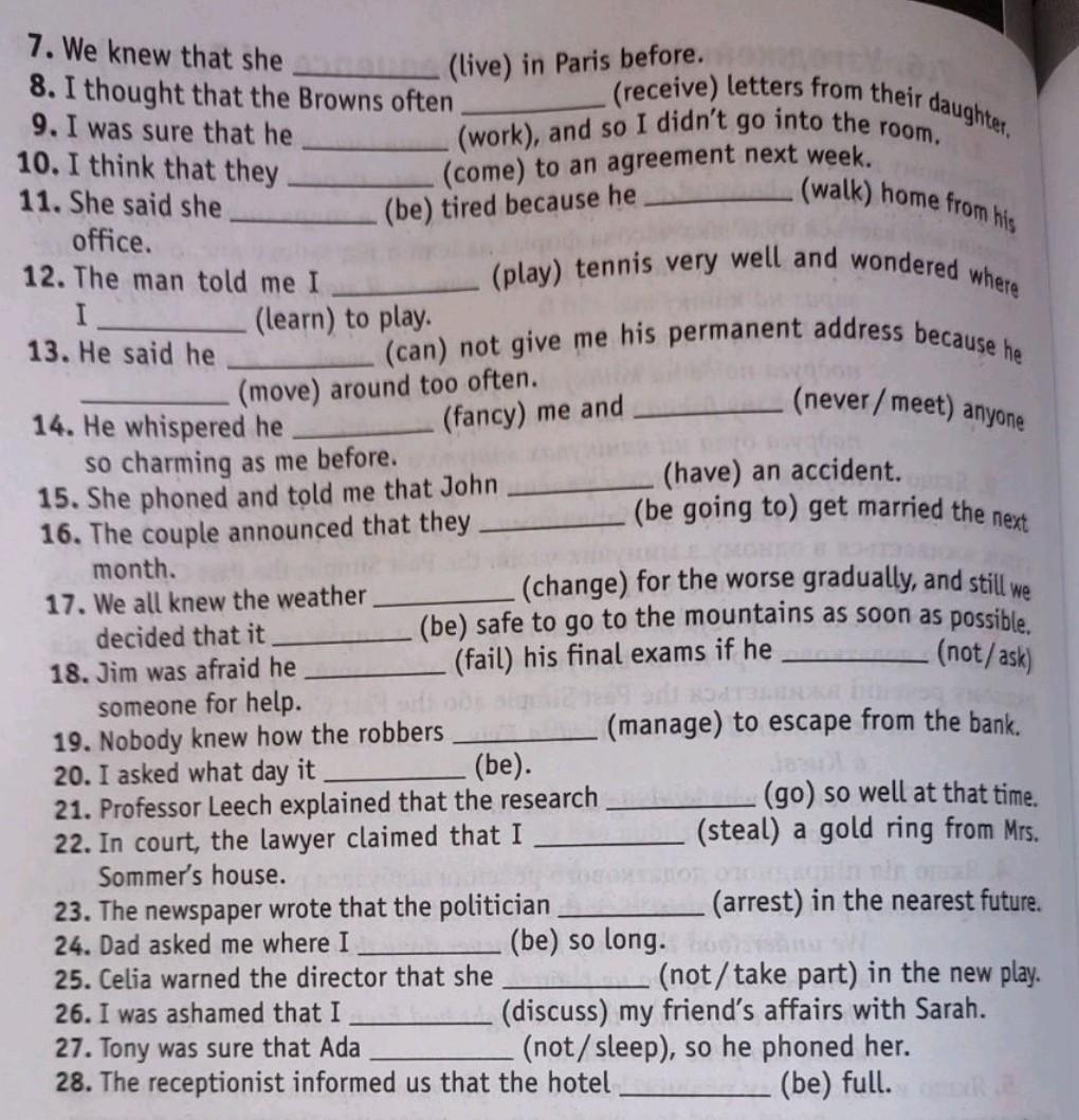 7. We knew that she 8. I thought that the Browns often 9. I was sure that he 10. I think that they 11. She said she office. 12. The man told me I I 13. He said he (learn) to play. (live) in Paris before. .(work), and so I didn't go into the room. (come) to an agreement next week. (walk) home from his (be) tired because he (play) tennis very well and wondered where .(can) not give me his permanent address because he (move) around too often. 14. He whispered he so charming as me before. 15. She phoned and told me that John 16. The couple announced that they month. 17. We all knew the weather decided that it 18. Jim was afraid he someone for help. 19. Nobody knew how the robbers 20. I asked what day it .(receive) letters from their daughter, (fancy) me and (change) for the worse gradually, and still we (be) safe to go to the mountains as soon as possible. (fail) his final exams if he .(not/ask) (manage) to escape from the bank. (be). 21. Professor Leech explained that the research 22. In court, the lawyer claimed that I Sommer's house. (never/meet) anyone (have) an accident. UNDIR .(be going to) get married the next 23. The newspaper wrote that the politician 24. Dad asked me where I 25. Celia warned the director that she 26. I was ashamed that I 0101 (arrest) in the nearest future. shu (not/take part) in the new play. (discuss) my friend's affairs with Sarah. (not/sleep), so he phoned her. (be) full. .(be) so long. (go) so well at that time. (steal) a gold ring from Mrs. 27. Tony was sure that Ada 28. The receptionist informed us that the hotel.