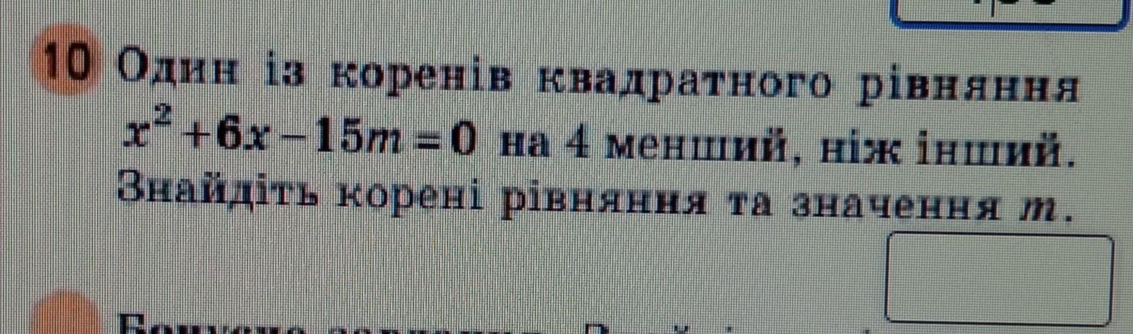 Один із коренів квадратного рівняння x²+6x-15m=0 на 4 менший, ніж інший. Знайдіть корені рівняння та значення m.