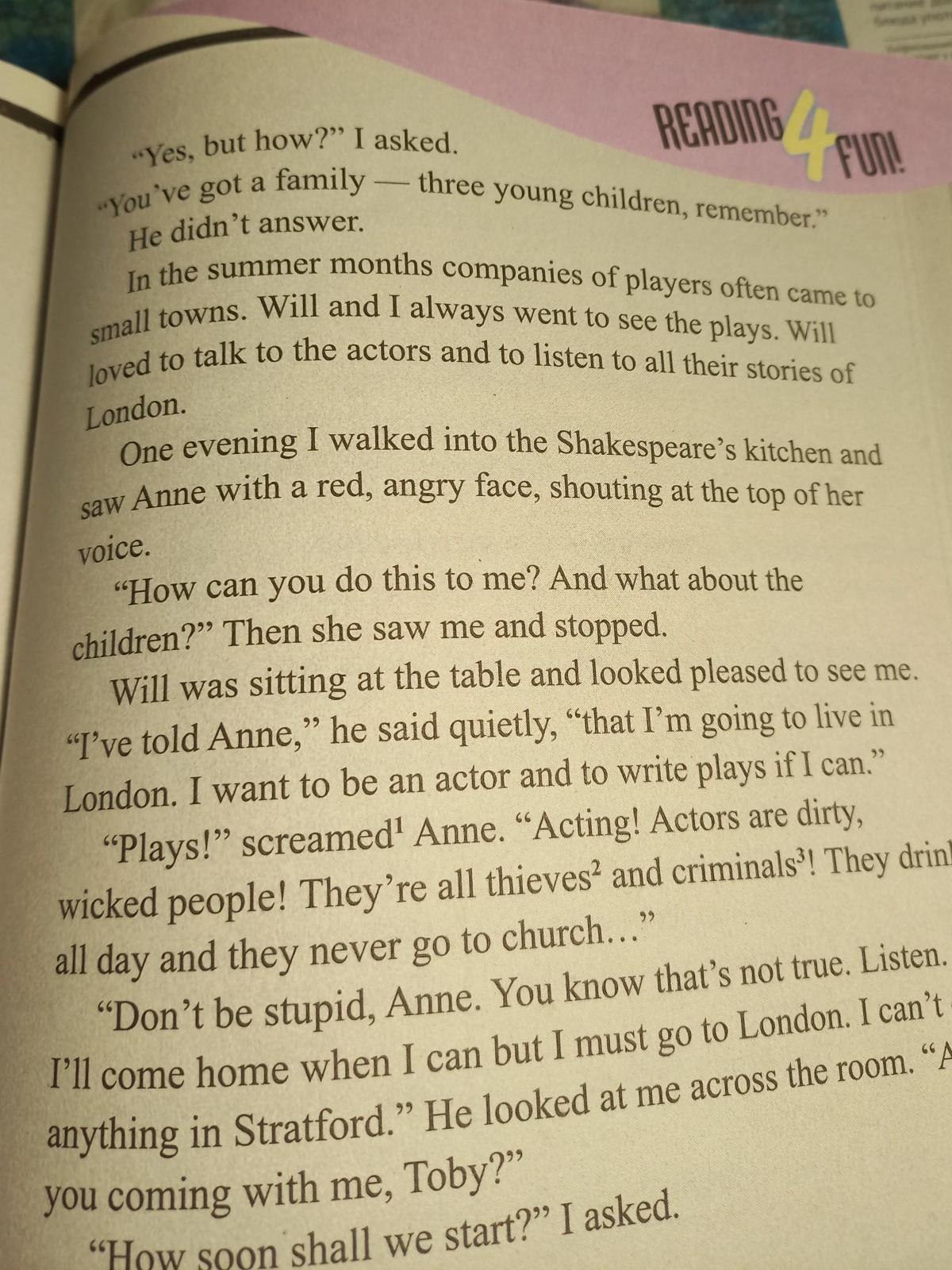 THE ACTORS COME TO TOWN (from the book W. Shakespeare' after Jennifer) Basset The story is told by William Shakespeare's friend, Toby William married Anne Hathaway in November and she came to live in Henley Street. Will was only eighteen. Susannah was born the next year. All babies look the same to me and Will was very pleased with her. "Look, Toby, she's got my eyes," he said happily. "She's going to be as beautiful as Queen of Egypt and as clever as King Solomon." "Oh yes!" I said. "All parents talk like that about their children." Soon in February 1585 I hurried round to Henley Street to hear the news. Will came running down the stairs. "It's two of them!" he said. "Twins! A girl and a boy. Isn't that wonderful!" Will called the twins' Hamnet and Judith ['dzu:die]. Will was still reading and writing but he had changed. He was twenty-three at that moment and he was not happy with his life. "Stratford's too small, Toby," he said. "Too slow. Too quiet. Too boring. I've got to get away."