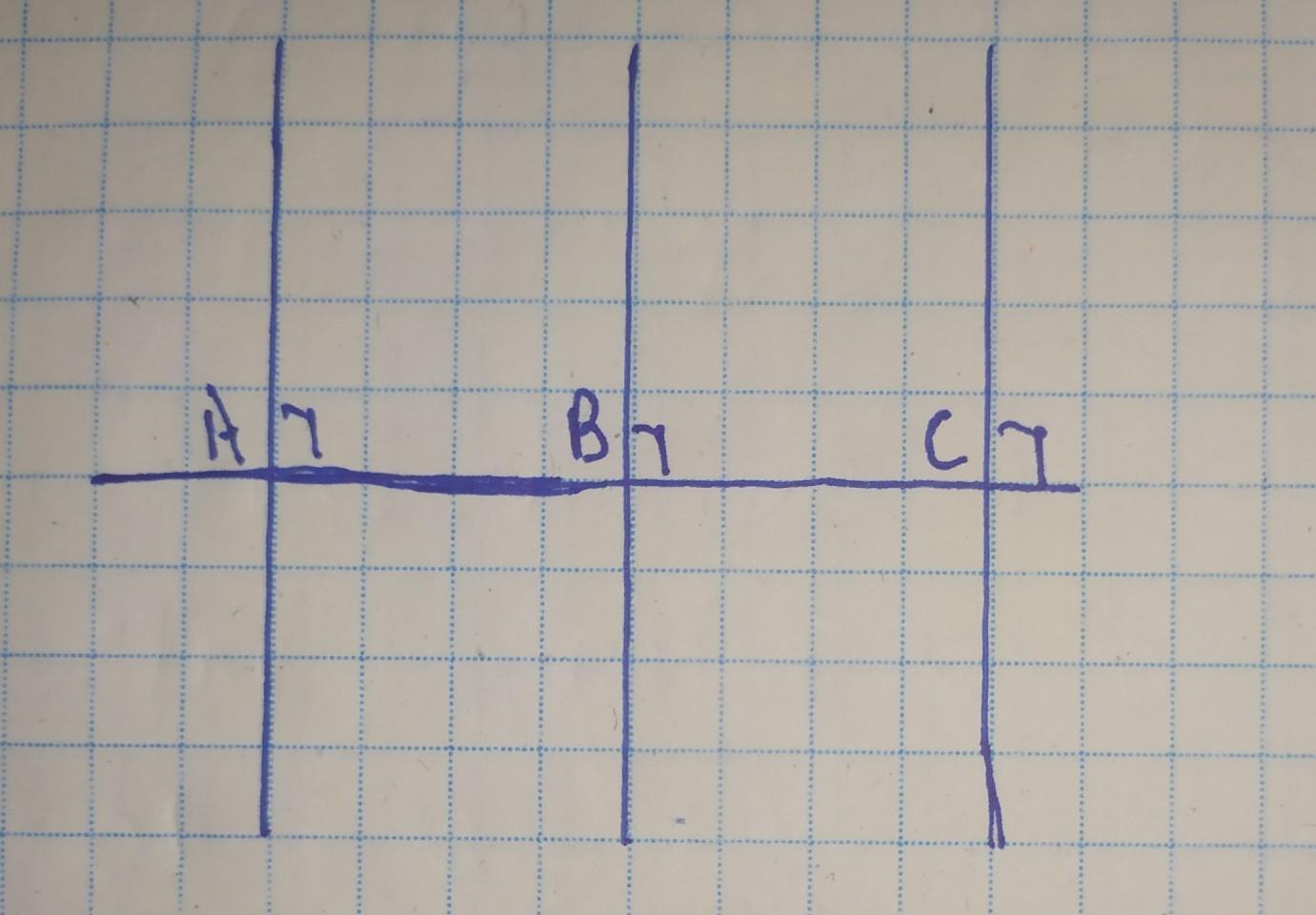 Накреслити пряму, поставити на ній три точки А, В і С, провести через ці точки прямі, перпендикулярні даній.