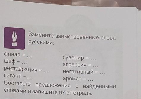 ПОМОГИТЕ ПОЖАЛУЙСТА ПРОШУ СРОЧНО НУЖНОЗамените заимствованные слова русскими: финал - ... шеф - ... реставрация - ... гигант -... аромат - ... Составьте предложения с найденными словами и запишите их в тетрадь. сувенир - ... агрессия - ... негативный - ...