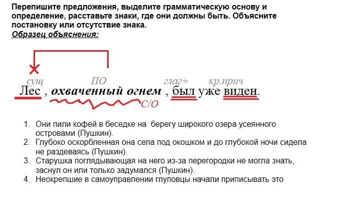 1. Они (сущ.) пили (===, глагол) кофей в беседке на берегу широкого озера×, усеянного островами (п/о, ~~~). (А.С. Пушкин)