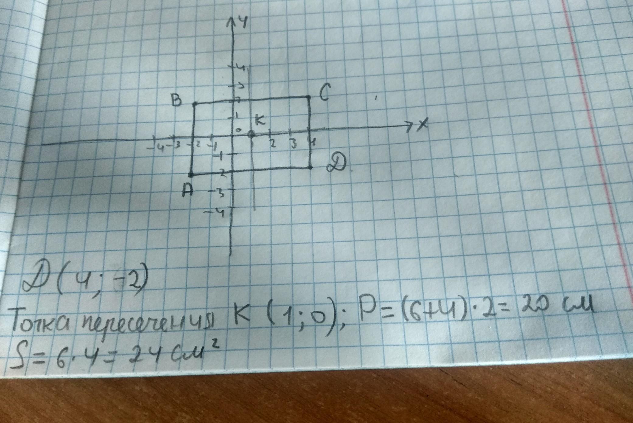 4. Дано координати трьох вершин прямокутника ABCD: A(-2;-2), B(-2;2), C(4;2). 1) Накресліть цей прямокутник. 2) Знайдіть координати вершини D. 3) 4) Знайдіть координати точки перетину діагоналей прямокутника. Обчисліть площу і периметр прямокутника, вважаючи, що довжина одиничного вiдрiзка координатних осей дорівнює 1 см.