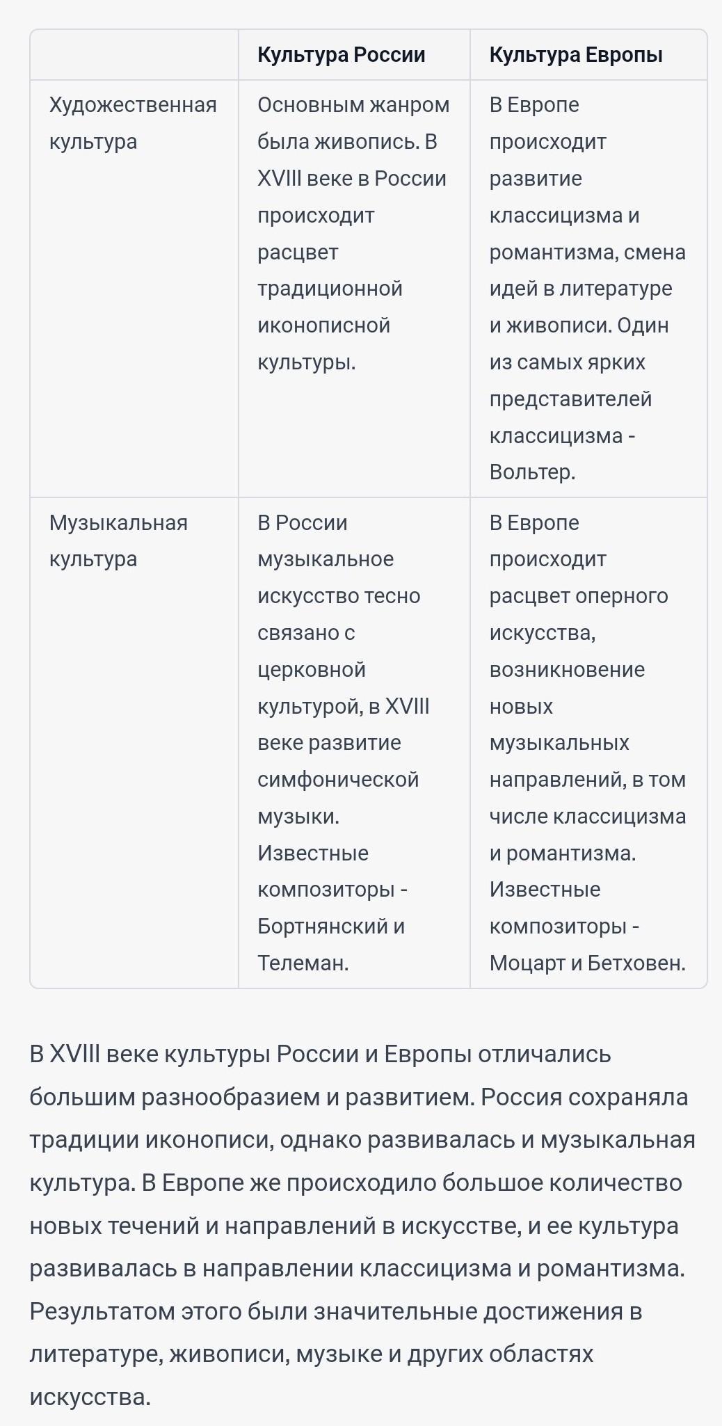 Заполните сравнительную таблицу «Культура России и Европы в XVIII веке». Укажите черты, достижения и известных авторов — всего до 2-х предложений для каждой ячейки. Сделайте вывод.