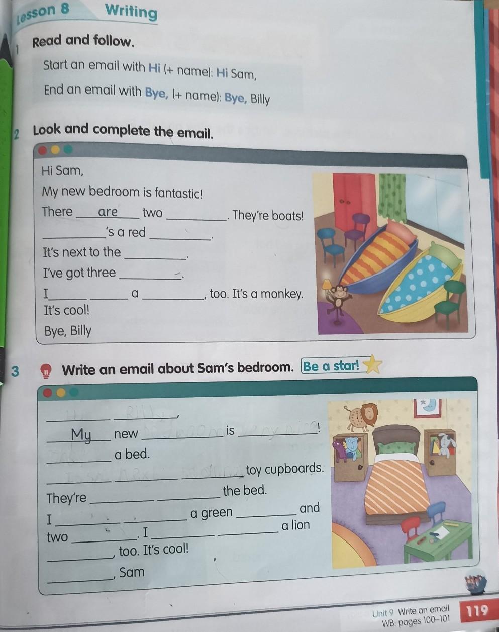 There's a red wardrobe.It's next to the beds. . I've got three chairs. I have got a toy ,too. It's a monkey. ....
