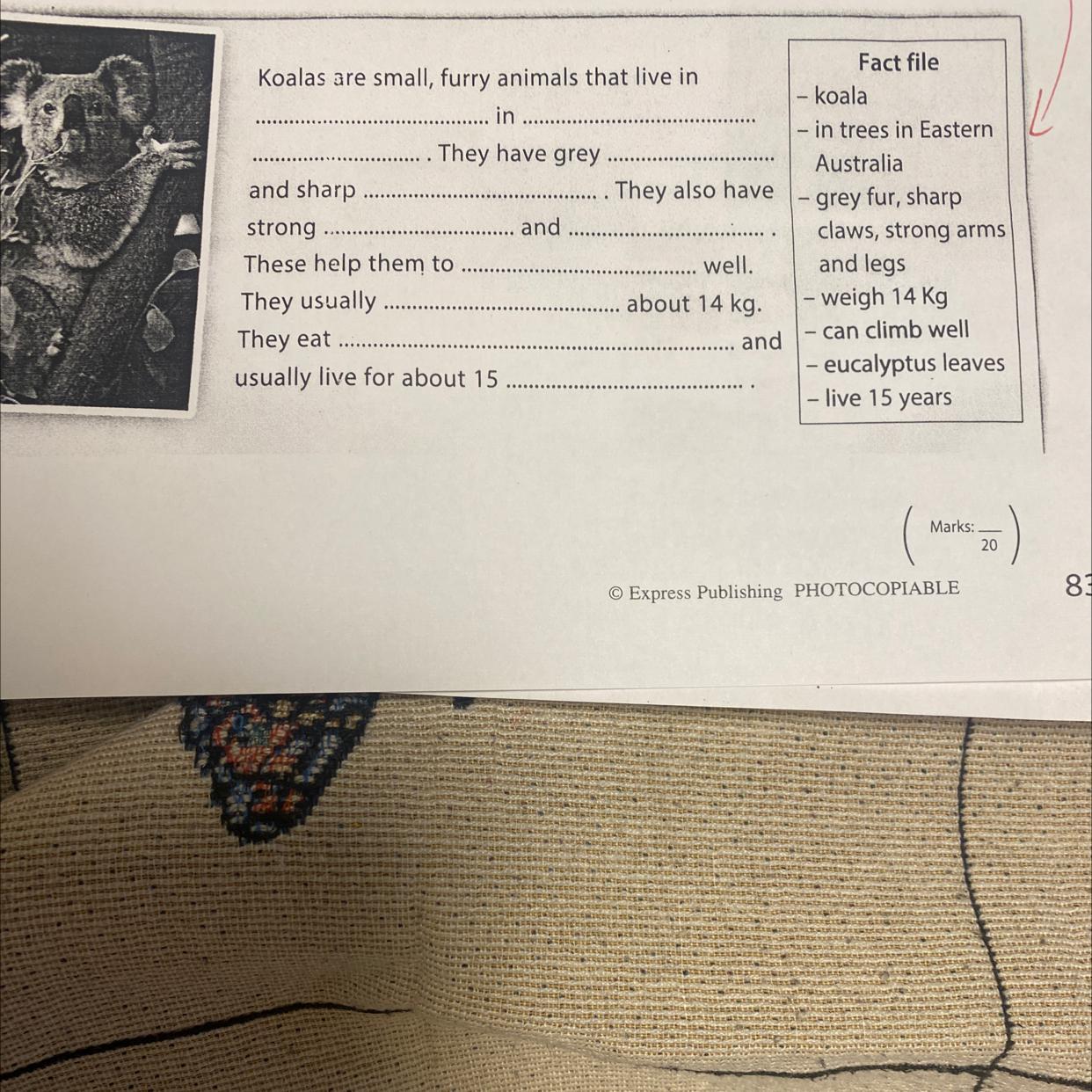 Ответ:1 trees, Eastern Australia. 2 fur, claws. 3 arm, legs. 4 climb. 5 weigh. 6 eucalyptus leaves, years.