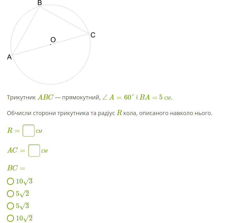Объяснение: За умовою в прямокутному трикутнику АВС ∠А=60°, значить другий гострий ∠С= 90°-60°=30°. Тепер треба використати відому властивість катета, який лежить проти кута, рівного 30° , цей катет дорівнює половині своєї гіпотенузи. Але сітуація трохи обернена: за умовою задано катет ВА=5 см, значить гіпотенуза АС в два рази більша за катет, тобто АС=10см. Другий катет знаходимо за теоремої Піфагора СВ =√10²-5²= √100-25=√75=√25·3=5√3(см). ВС=5√3 (см). Тепер шукаємо радіус описаного навколо ΔАВС кола, по-перше він дорівнює половині діаметру кола а по-друге, діаметр кола за відомою теоремою дорівнює гіпотенузі прямокутного трикутника, навколо якого він описаний. Радіус R=1/2АС=1/2·10=5(см), R=5см.
