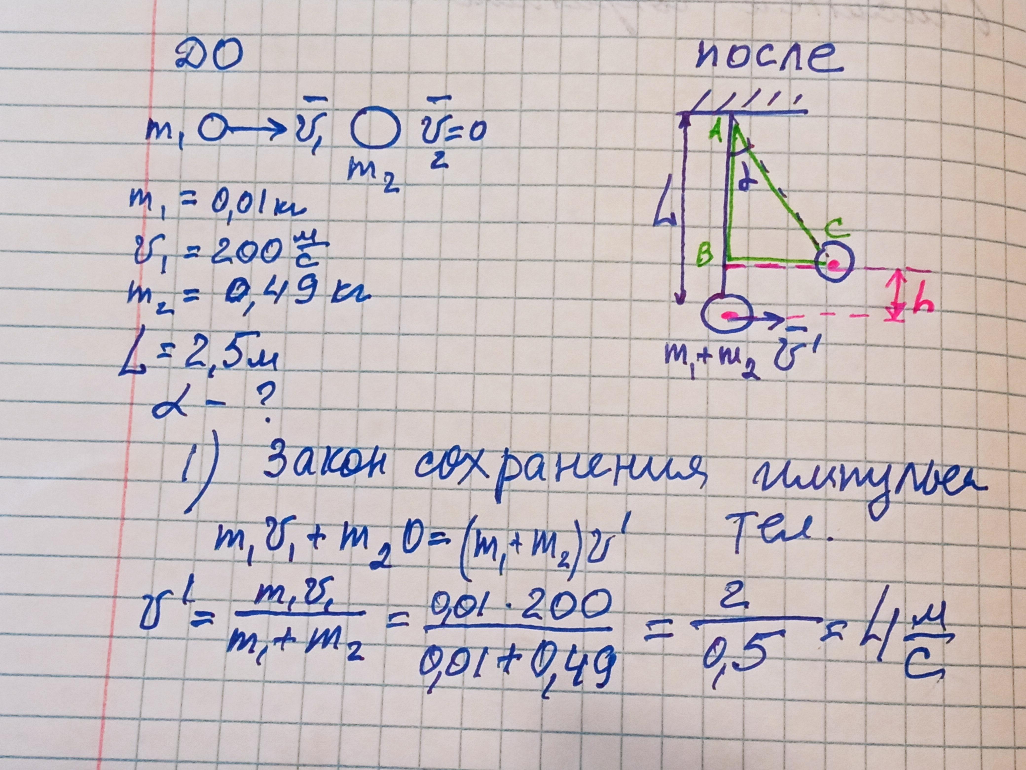 Куля масою 10 г, що летіла горизонтально зі швидкістю 200 м/с, влучає в тіло масою 0,49 кг, підвішене на нитці завдовжки 2,5 м, і застряє в ньому. Визначити кут відхилення даного маятника.