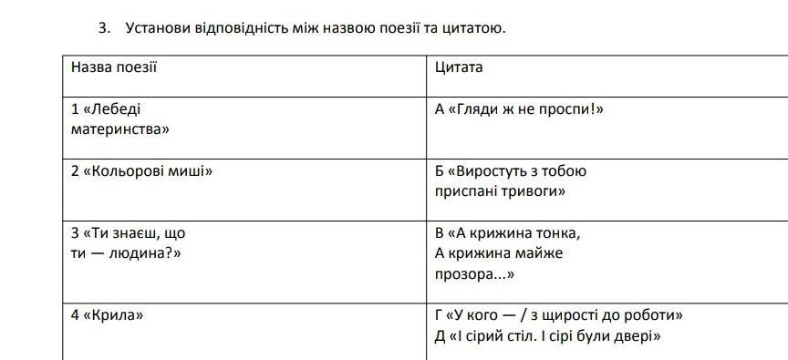 3. установи вiдповiднiсть мiж назвою поезії та цитатою. Назва поезії 1 > 4 «Крила>> Цитата А «Гляди ж не проспи!» Б «Виростуть з тобою приспанi тривоги» В > Г «У кого-/з щирості до роботи» Д «I сірий стіл. I сірі були двері>>