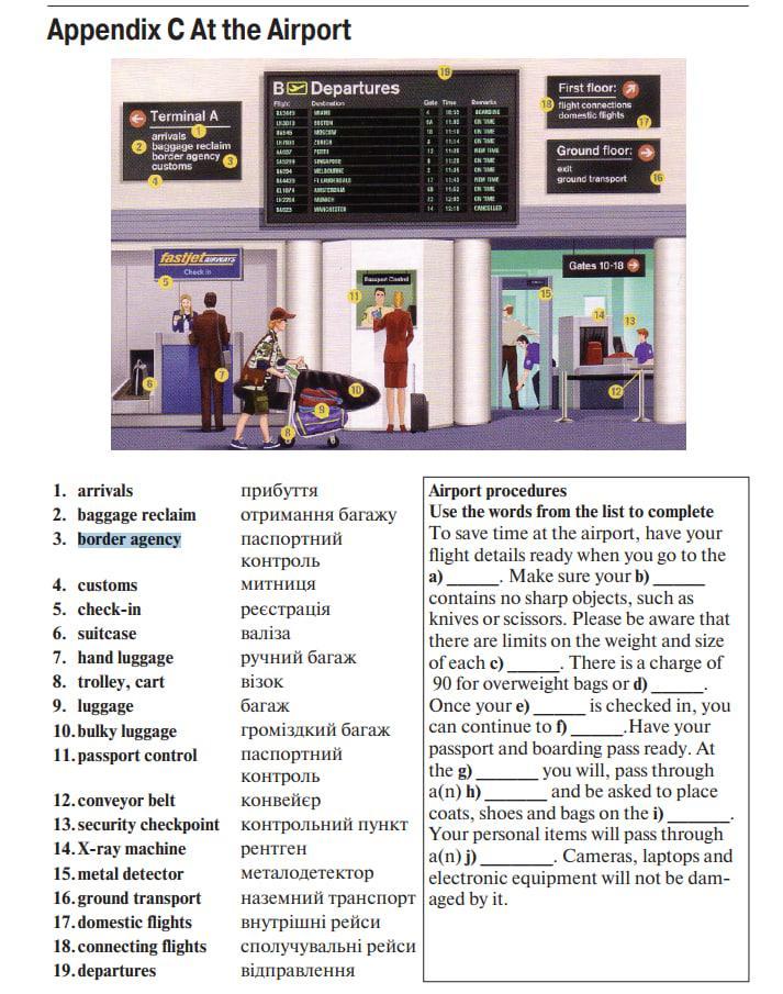 Приготовьте паспорт и посадочный талон. В g) ______ вы пройдете через a(n) h) ______ и вас попросят положить пальто, обувь и сумки на i) ______. Ваши личные вещи будут проходить через a(n)j) _______. Камеры, ноутбуки и электронное оборудование не пострадают от него.