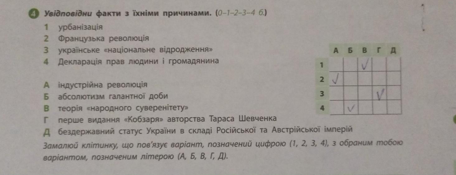 Увідповідни факти з їхніми причинами. (0-1-2-3-4 б.) 1 урбанізація 2 французька революція 3 Українське «національне відродження» 4 Декларація прав людини і громадянина A iндустрiйна лю Б абсолютизм галантної доби 1 2 3 4 А Б В Г Д В теорія «народного суверенітету» Г перше видання «Кобзаря» авторства Тараса Шевченка д бездержавний статус України в складі Російської та Австрійської імперій Замалюй клітинку, що пов'язує варіант, позначений цифрою (1, 2, 3, 4), з обраним тобою варіантом, позначеним літерою (А, Б, В, Г, Д).