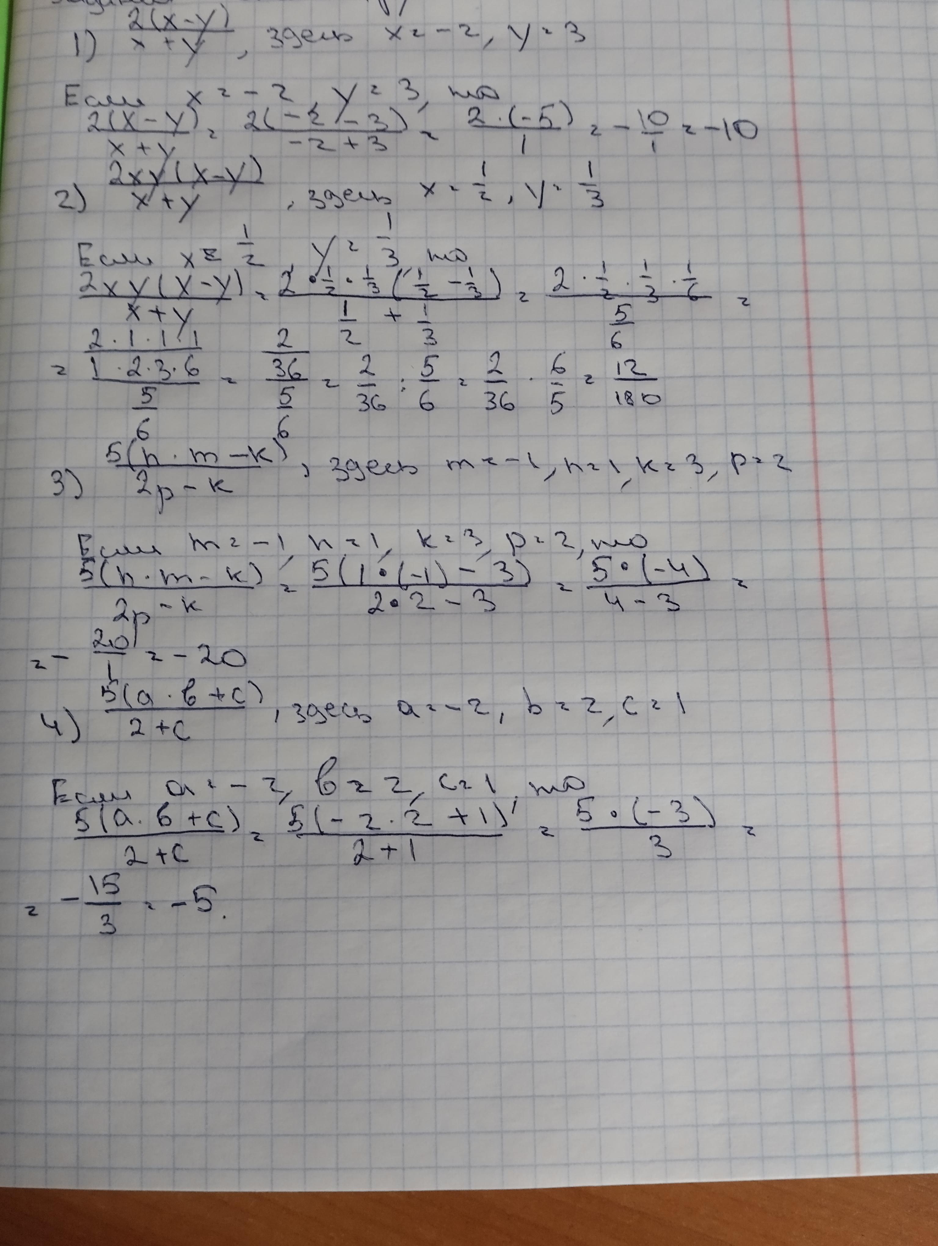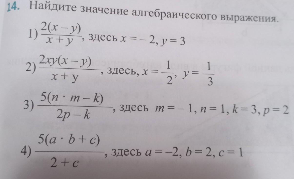 14. Найдите значение алгебраического выражения. 2(x-y) x + y 1) 2) 3) " здесь х =-2,y=3 2ху(х - у) x + y 4)- . 5(n · m - k) 2p-k -, здесь, х = 5(a.b+c) 2+c — 2, y = 3 , 2' 1 3 здесь _ m = – 1, n = 1, k = 3, p = 2 -, здесь а = -2, b = 2, c = 1